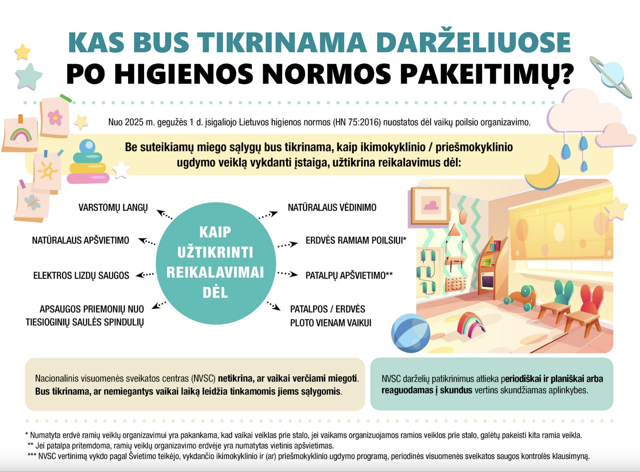 HN 75:2016 8 punktas numato, kad jei vaikų ugdymas vykdomas ilgiau nei 4 val., turi būti organizuojamas vaikų maitinimas ir poilsis (miegas ir (ar) ramios veiklos) tam skirtose patalpose ir (ar) pritaikytose erdvėse. Taip pat, kad vaikams turi būti užtikrinta jų fiziologinius poreikius atitinkanti poilsio forma (miegas arba rami veikla) ir trukmė.